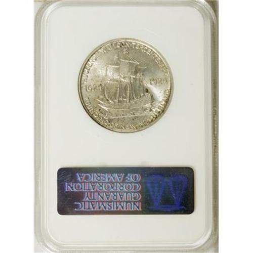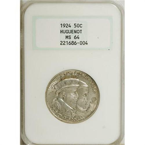 <B>1924 50C Huguenot MS64 NGC.</B></I> NGC Census: (1233/1231). PCGS Population (1375/1200). Mintage: 142,080. Numismedia Wsl. Price for NGC/PCGS coin in MS64: $200. (#9314)<BR><BR><b>Shipping:</b> Coins & Currency (<a target="_blank" href="http://www.heritageauctions.com/common/shipping.php">view shipping information</a>)