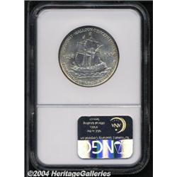 <B>1924<50C> Huguenot MS65 NGC.</B></I> Well struck with somewhat granular, matte-like surface textures, bright luster, a few wispy die striations (as struck) in the reverse fields, and a minimal number of small surface marks. <BR><BR><B>Important notice:</B> Heritage usually auctions material at the rate of 200-250 lots per hour. On some occasions eBay Live bid software or the Internet may not be able to keep up with the pace of the auction. We recommend placing a realistic absentee bid now as insurance to avoid disappointment. Occasionally the auctioneer may eliminate or reject an eBay Live bid, and the auctioneer may also reopen a lot after the close of the eBay live bidding (usually because we missed an audience bid), and may reject your bid even if it shows you as the winning bidder. By bidding via eBay Live, you agree that Heritage may award the lot to another bidder at its sole discretion under the circumstances described above or any other reasonable circumstances. Since eBay bids are not shown to us until we open the lot on the floor, we treat those bids just like floor bids. In most cases the floor responds before the eBay bid is presented to us, due to Internet lag time, so for consistency we have made it a policy that floor bids are always considered first over tie eBay live bids. Also please note that all Heritage lots purchased through eBay Live carry a 20% Buyer's Premium. Please make sure you read the Terms and Conditions before you bid.