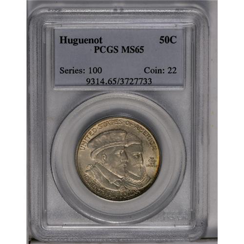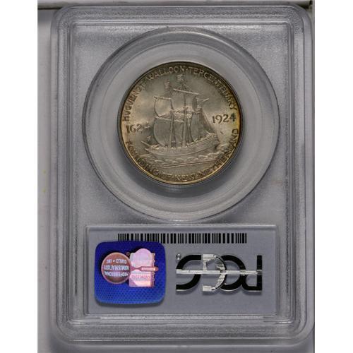 <B>1924<50C> Huguenot MS65 PCGS.</B></I> A frosty Gem with subdued luster beneath gray-brown and iridescent toning. Each side has a thin band of vivid green and rose color near the border.