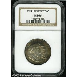 <B>1924 50C Huguenot MS66 NGC.</B></I> Sparkling mint luster and untoned centers, the peripheries are adorned by the most beautiful dark multicolored patina imaginable. A few tiny contact marks are well hidden by the rich toning. A truly remarkable premium quality Gem. Lot:8509