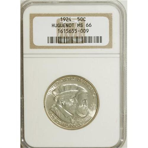 <B>1924 50C Huguenot MS66 NGC.</B></I> NGC Census: (263/34). PCGS Population (298/37). Mintage: 142,080. Numismedia Wsl. Price for NGC/PCGS coin in MS66: $1,000. (#9314)<BR><BR><b>Shipping:</b> Coins & Currency (<a target="_blank" href="http://www.heritageauctions.com/common/shipping.php">view shipping information</a>\)