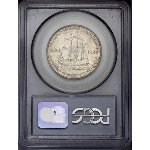 <B>1924<50C> Huguenot MS66 PCGS.</B></I> Brilliant with amber and ice-blue glints. A tick is noted on the cheek of M. de Coligny. High-end and pleasing. PCGS has graded only 35 finer (3/06). <BR><BR><B>Important notice:</B> Heritage usually auctions material at the rate of 200-250 lots per hour. On some occasions eBay Live bid software or the Internet may not be able to keep up with the pace of the auction. We recommend placing a realistic absentee bid now as insurance to avoid disappointment. Occasionally the auctioneer may eliminate or reject an eBay Live bid, and the auctioneer may also reopen a lot after the close of the eBay live bidding (usually because we missed an audience bid), and may reject your bid even if it shows you as the winning bidder. By bidding via eBay Live, you agree that Heritage may award the lot to another bidder at its sole discretion under the circumstances described above or any other reasonable circumstances. Since eBay bids are not shown to us until we open the lot on the floor, we treat those bids just like floor bids. In most cases the floor responds before the eBay bid is presented to us, due to Internet lag time, so for consistency we have made it a policy that floor bids are always considered first over tie eBay live bids. Also please note that all Heritage lots purchased through eBay Live carry a 20% Buyer's Premium. Please make sure you read the Terms and Conditions before you bid. This lot is being auctioned in conjunction with a live floor auction by Heritage Galleries & Auctioneers. All final auction and invoice information will be supplied by Heritage Galleries & Auctioneers, and all other information should be considered preliminary. Lot:4968 <BR><BR><B>Winning Notification and Billing:</B> After the FINAL session in this auction is complete, Heritage will send e-mail and snail mail invoices. This process normally takes several days. All final auction and invoice information will be supplied by Heritage Galleries & Auctioneers, and all other information should be considered preliminary. <BR><BR>This auction will be conducted on a live auction floor and over the Internet through eBay Live. If you choose to place an absentee bid, please take a moment to <font color='#0000ff'><u><a href='http://pages.ebay.com/liveauctions/help/before/laabsentee.html'>learn how eBay Live absentee bidding works</a></u></font><font color='#000000'>