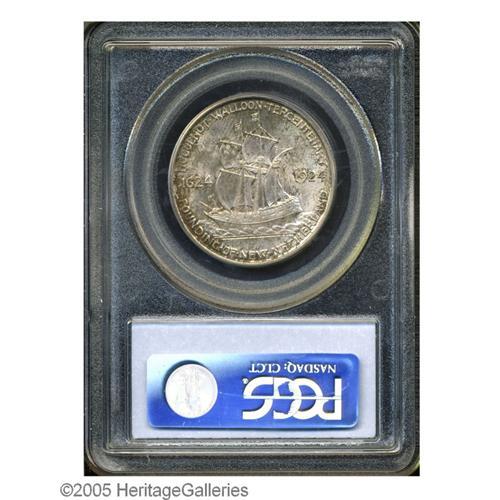<B>1924<50C> Huguenot MS66 PCGS.</B></I> Dappled olive-green patina overlies lustrous surfaces that bear faint hints of sky-blue color, and the design elements are sharply struck. A couple of minor marks that are consistent with the grade level occur on Coligny's cheek. PCGS has certified 35 pieces finer (9/05).