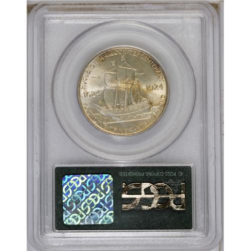 <B>1924 50C Huguenot MS66 PCGS.</B></I> Highly lustrous with splashes of sky-blue, gold, and orange on each side. The portraits and ship have suitable detail and are free of distracting marks.<BR><BR><b>Shipping:</b> Coin/Currency (<a target="_blank" href="http://www.heritageauctions.com/common/shipping.php">view shipping information</a>)
