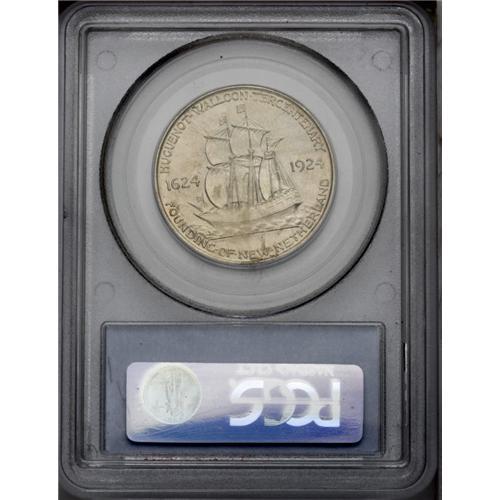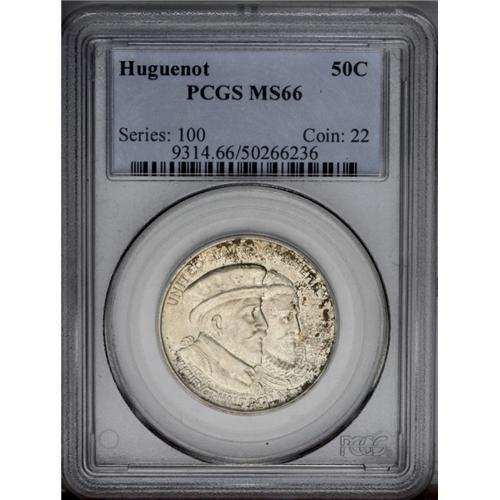 <B>1924<50C> Huguenot MS66 PCGS.</B></I> Speckles of golden-brown toning adhere to the borders. Sharply struck and lustrous. A few small abrasions are noted on the masts and rear sail of the ship. <BR><BR><B>Important notice:</B> Heritage usually auctions material at the rate of 200-250 lots per hour. On some occasions eBay Live bid software or the Internet may not be able to keep up with the pace of the auction. We recommend placing a realistic absentee bid now as insurance to avoid disappointment. Occasionally the auctioneer may eliminate or reject an eBay Live bid, and the auctioneer may also reopen a lot after the close of the eBay live bidding (usually because we missed an audience bid), and may reject your bid even if it shows you as the winning bidder. By bidding via eBay Live, you agree that Heritage may award the lot to another bidder at its sole discretion under the circumstances described above or any other reasonable circumstances. Since eBay bids are not shown to us until we open the lot on the floor, we treat those bids just like floor bids. In most cases the floor responds before the eBay bid is presented to us, due to Internet lag time, so for consistency we have made it a policy that floor bids are always considered first over tie eBay live bids. Also please note that all Heritage lots purchased through eBay Live carry a 20% Buyer's Premium. Please make sure you read the Terms and Conditions before you bid. This lot is being auctioned in conjunction with a live floor auction by Heritage Galleries & Auctioneers. All final auction and invoice information will be supplied by Heritage Galleries & Auctioneers, and all other information should be considered preliminary. Lot:4966 <BR><BR><B>Winning Notification and Billing:</B> After the FINAL session in this auction is complete, Heritage will send e-mail and snail mail invoices. This process normally takes several days. All final auction and invoice information will be supplied by Heritage Galleries & Auctioneers, and all other information should be considered preliminary. <BR><BR>This auction will be conducted on a live auction floor and over the Internet through eBay Live. If you choose to place an absentee bid, please take a moment to <font color='#0000ff'><u><a href='http://pages.ebay.com/liveauctions/help/before/laabsentee.html'>learn how eBay Live absentee bidding works</a></u></font><font color='#000000'>