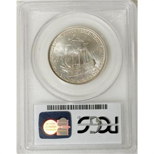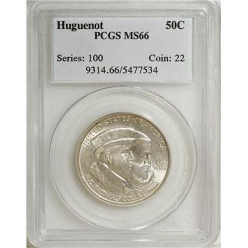 <B>1924 50C Huguenot MS66 PCGS.</B></I> Delicate blue and sea-green patina graces the lustrous surfaces of this Coolidge-era commemorative, quaint in that it was the only such issue for the year. Attentively detailed with only isolated, inoffensive marks in out-of-the-way areas.<BR><I>From The Sterling Collection.</B></I><BR><BR><b>Shipping:</b> Coins & Currency (<a target="_blank" href="http://www.heritageauctions.com/common/shipping.php">view shipping information</a>)