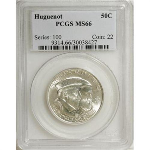 <B>1924 50C Huguenot MS66 PCGS.</B></I> Well-defined as usual with fabulous deep luster and essentially brilliant, expertly preserved surfaces. An enticing Premium Gem example of this 1920s commemorative, perhaps best known for its questionable constitutionality.<BR><BR><b>Shipping:</b> Coins & Currency (<a target="_blank" href="http://www.heritageauctions.com/common/shipping.php">view shipping information</a>)