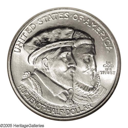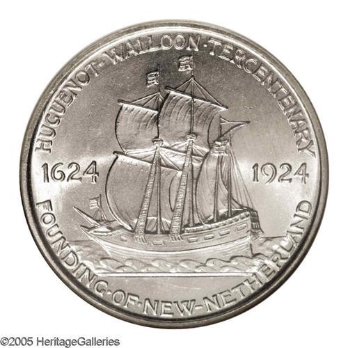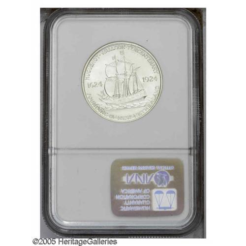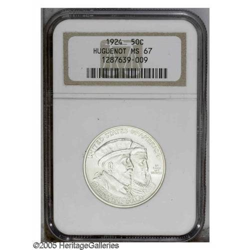 <B>1924<50C> Huguenot MS67 NGC.</B></I> This nearly brilliant Superb Gem features dazzling cartwheel luster, and only minor contact is detected upon thorough evaluation. Fully struck, and unattainably any finer, since neither NGC or PCGS (as of 10/05) have certified a piece above the MS67 level. Neither of the two Huguenots depicted on the obverse participated in the founding of New Netherland, and in fact had died two generations prior to the commemorated American settlements.<BR><I>From The Clearfield Collection.</B></I>