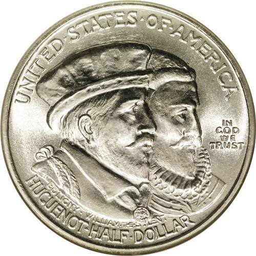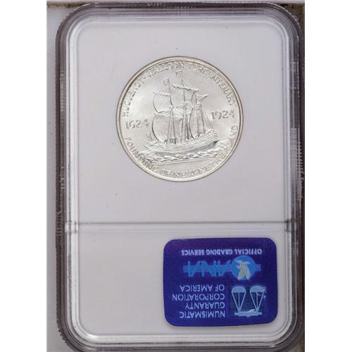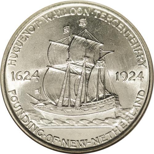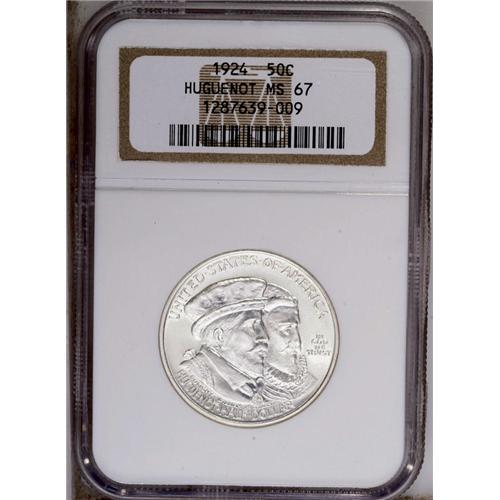 <B>1924<50C> Huguenot MS67 NGC.</B></I> This nearly brilliant Superb Gem features dazzling cartwheel luster, and only minor contact is detected upon thorough evaluation, more so on the rims than on the faces. Boldly struck on the design elements, and unattainable any finer, since neither NGC nor PCGS (as of 4/06) has certified a piece above the MS67 level. Neither of the two Huguenots depicted on the obverse participated in the founding of New Netherland, and in fact had died two generations prior to the commemorated American settlements! This engendered debate concerning the appropriateness of these portraits, with the conclusion that they were irrelevant to the subject being commemorated. Nevertheless, the coin itself is of undeniable "superb" quality, and will surely elicit spirited bidding.