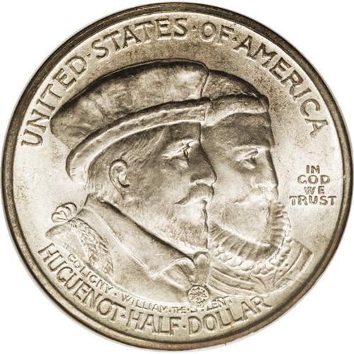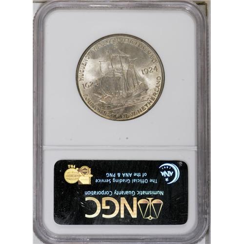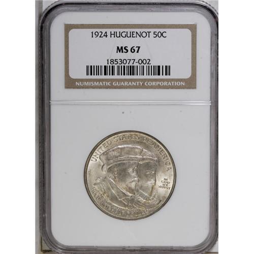 <B>1924 50C Huguenot MS67 NGC.</B></I> With its portraits of questionable relevance and the ultimate destination of the proceeds, the Huguenot commemorative presaged some of the more egregious abuses of later commemorative programs. This highly lustrous piece is one of the finest survivors of this issue. The ship is well defined, and the surfaces have pleasing reddish-gold patina. Neither NGC nor PCGS has graded a finer example (10/06).<BR><BR><b>Shipping:</b> Coin/Currency (<a target="_blank" href="http://www.heritageauctions.com/common/shipping.php">view shipping information</a>)