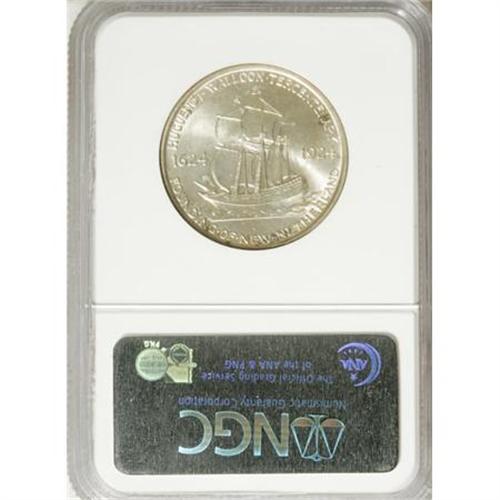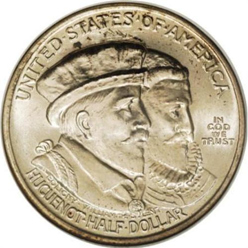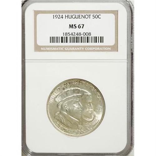 <B>1924 50C Huguenot MS67 NGC.</B></I> Clash marks from the sails are present above the Coligny's nose and near the left (facing) mustache of William the Silent. Delicate golden patina graces much of this Huguenot half, while splashes of russet color appear at the periphery. Soft, pleasing luster shines beneath the toning, and the portraits and ship show strong detail. An attractive example of this classic commemorative, one that remains controversial to this day due to its apparent violation of the Establishment Clause. One of 34 Superb Gems graded by NGC, with none finer (6/07).<BR><I>From The Frank DuVall Collection of U.S. Commemoratives.</B></I><BR><BR><b>Shipping:</b> Coins & Currency (<a target="_blank" href="http://www.heritageauctions.com/common/shipping.php">view shipping information</a>\)