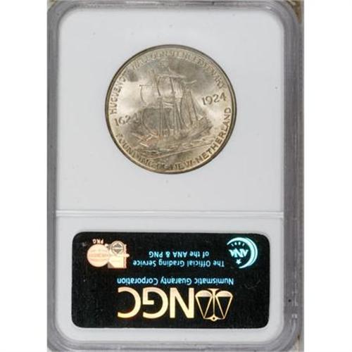<B>1924 50C Huguenot MS67 NGC.</B></I> This highly lustrous piece is one of the finest survivors of this Roaring Twenties commemorative issue. The ship is well-defined, and the surfaces have pleasing reddish-gold patina. Neither NGC nor PCGS has graded a finer example (10/07).<BR><BR><b>Shipping:</b> Coins & Currency (<a target="_blank" href="http://www.heritageauctions.com/common/shipping.php">view shipping information</a>)
