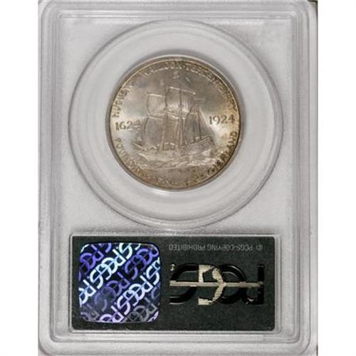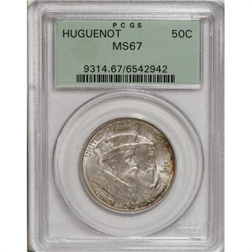 <B>1924 50C Huguenot MS67 PCGS.</B></I> This lovely representative offers subtle, strong luster beneath silver-gray and golden-tan toning, the latter appearing primarily at the margins. Well struck and magnificently preserved. Neither NGC nor PCGS has graded a finer representative of this Roaring Twenties commemorative issue (12/07).<BR><BR><b>Shipping:</b> Coins & Currency (<a target="_blank" href="http://www.heritageauctions.com/common/shipping.php">view shipping information</a>)