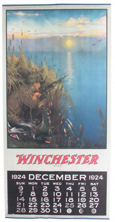 1924 Calendar for Winchester Arms Co. Duck hunting image by artist G. Ryder. Original bands top and bottom, December page only. Some horizontal wrinkles and wear mostly around edges otherwise very good condition. 14 X 28 inches.