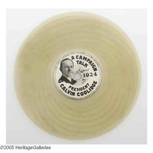 <B>Scarce 1924 Calvin Coolidge Campaign Speech Phonograph Record.</B></I> We frankly do not know anyone who has ever actually tried to play one of these, but this has always been a popular display item with collectors because of the great center label. Excellent condition. Diameter 4.625".