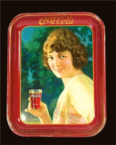 1924 Coca Cola Tin Serving Tray, maroon border. Some rim chips and minor surface scratches otherwise excellent condition. 10 1/2 X 13 1/4 inches.