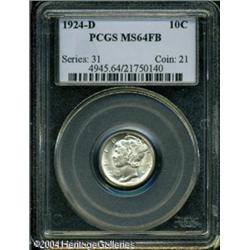 1924-D 10C MS64 Full Bands PCGS. Booming cartwheel <B>1924-D 10C MS64 Full Bands PCGS.</B></I> Booming cartwheel luster and wisps of medium apricot color combine with an exemplary strike to provide imposing eye appeal. The obverse center has a mint-made orange peel texture, also found on certain Peace Dollar issues from this era. <BR><BR><B>Important notice:</B> Heritage usually auctions material at the rate of 200-250 lots per hour. On some occasions eBay Live bid software or the Internet may not be able to keep up with the pace of the auction. We recommend placing a realistic absentee bid now as insurance to avoid disappointment. Occasionally the auctioneer may eliminate or reject an eBay Live bid, and the auctioneer may also reopen a lot after the close of the eBay live bidding (usually because we missed an audience bid), and may reject your bid even if it shows you as the winning bidder. By bidding via eBay Live, you agree that Heritage may award the lot to another bidder at its sole discretion under the circumstances described above or any other reasonable circumstances. Since eBay bids are not shown to us until we open the lot on the floor, we treat those bids just like floor bids. In most cases the floor responds before the eBay bid is presented to us, due to Internet lag time, so for consistency we have made it a policy that floor bids are always considered first over tie eBay live bids. Also please note that all Heritage lots purchased through eBay Live carry a 20% Buyer's Premium. Please make sure you read the Terms and Conditions before you bid. This lot is being auctioned in conjunction with a live floor auction by Heritage Galleries & Auctioneers. All final auction and invoice information will be supplied by Heritage Galleries & Auctioneers, and all other information should be considered preliminary. Lot:5806