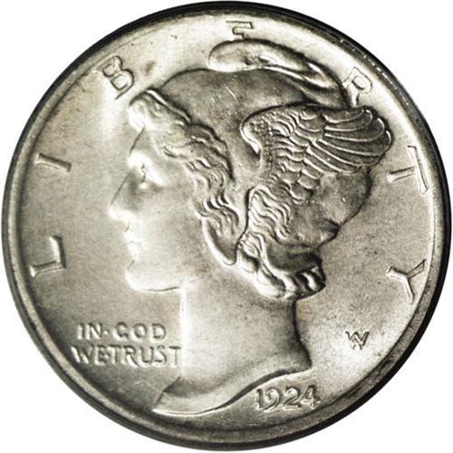 <B>1924-D<10C> MS66 Full Bands PCGS.</B></I> A fully brilliant Gem in an older green-label holder. The surfaces have frosty silver luster and the design elements are boldly rendered. Very few finer examples of this scarce date have been certified by PCGS. Population: 34 in 66, 9 finer (4/06).
