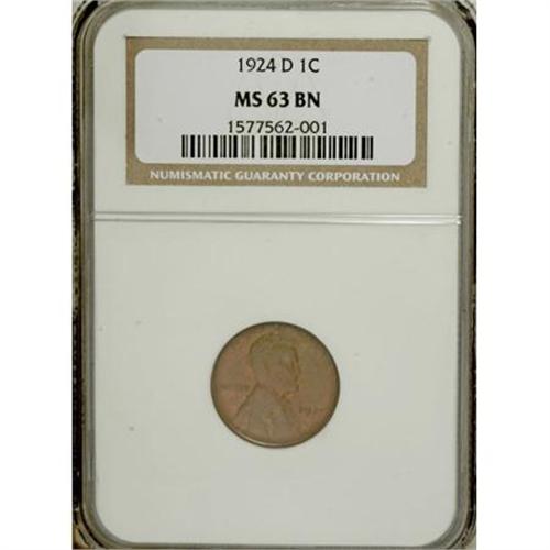 <B>1924-D 1C MS63 Brown NGC.</B></I> Whispers of mellowed pumpkin-orange visit the deep brown-bronze surfaces of this quicksilver Select example. Well struck with a measure of weakness, a typical aspect of D-mint cents from the Roaring Twenties. Census: 26 in 63 Brown, 40 finer (10/07).<BR><BR><B>Coin Engraver:</B> Victor D. Brenner<BR><BR><b>Shipping:</b> Coins & Currency (<a target="_blank" href="http://www.heritageauctions.com/common/shipping.php">view shipping information</a>)