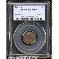 <B>1924-D<1C> MS64 Brown PCGS.</B></I> This better-date Lincoln cent is a pale golden-brown with olive and tan overtones. A few small toning spots and flyspecks are hardly noticeable and concealed in the toning. Population: 15 in 64, 7 finer (3/04). <BR><BR><B>Important notice:</B> Heritage usually auctions material at the rate of 200-250 lots per hour. On some occasions eBay Live bid software or the Internet may not be able to keep up with the pace of the auction. We recommend placing a realistic absentee bid now as insurance to avoid disappointment. Occasionally the auctioneer may eliminate or reject an eBay Live bid, and the auctioneer may also reopen a lot after the close of the eBay live bidding (usually because we missed an audience bid), and may reject your bid even if it shows you as the winning bidder. By bidding via eBay Live, you agree that Heritage may award the lot to another bidder at its sole discretion under the circumstances described above or any other reasonable circumstances. Since eBay bids are not shown to us until we open the lot on the floor, we treat those bids just like floor bids. In most cases the floor responds before the eBay bid is presented to us, due to Internet lag time, so for consistency we have made it a policy that floor bids are always considered first over tie eBay live bids. Also please note that all Heritage lots purchased through eBay Live carry a 20% Buyer's Premium. Please make sure you read the Terms and Conditions before you bid.