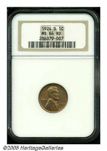 <B>1924-D<1C> MS64 Red NGC.</B></I> A lustrous straw-gold near-Gem with well struck wheat ears and moderate softness on the shoulder and the O in ONE. No unpleasant marks are present.