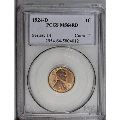 <B>1924-D<1C> MS64 Red PCGS.</B></I> The obverse is highly original with pale copper-orange surfaces. The sharply struck reverse has turned somewhat, with significant patches of violet from multiple fingerprints. Still a lovely near-Gem with plenty of eye appeal.<BR><I>From The Tigard Oregon Small Cent Collection.</B></I>