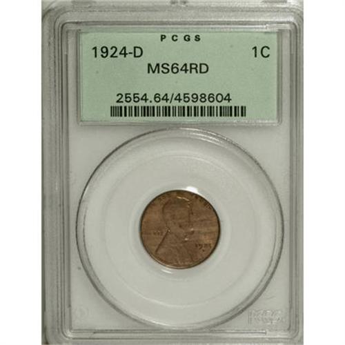 <B>1924-D 1C MS64 Red PCGS.</B></I> Well struck for the issue, with pleasing satin luster and attractive coloration. Faint toning streaks are noted on each side, but surface blemishes are nearly nonexistent. According to David Lange (2005): "A semi-key date in all grades, 1924-D is scarce and always in demand." <BR><BR><b>Shipping:</b> Coins & Currency (<a target="_blank" href="http://www.heritageauctions.com/common/shipping.php">view shipping information</a>)