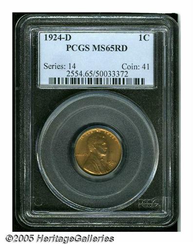 <B>1924-D<1C> MS65 Red PCGS.</B></I> This is a very important opportunity to acquire a brilliant Gem as certified by PCGS. Among all the Lincoln Cents from the Roaring Twenties, the 1924-D is among the hardest to locate with fully brilliant luster. Both sides have a brilliant and fresh orange appearance. About 30 degrees of counterclockwise die rotation is also noted. Population: 30 in 65, 1 finer (6/05).<BR><I>From The William Bickel Collection, Part One.</B></I>