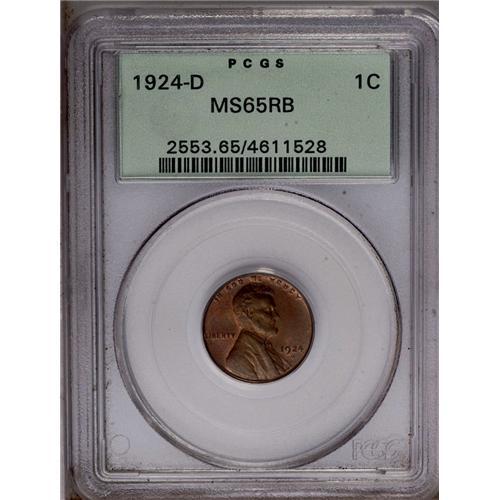 <B>1924-D<1C> MS65 Red and Brown PCGS.</B></I> The brick-red obverse approaches full Red, although portrait highpoints offer aqua toning. The reverse features blended aqua and chestnut patina. An unabraded Gem of this underappreciated issue. Encapsulated in a green label holder.