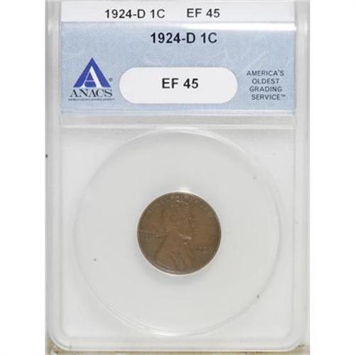 <B>1924-D 1C XF45 ANACS.</B></I> NGC Census: (45/151). PCGS Population (62/171). Mintage: 2,520,000. Numismedia Wsl. Price for NGC/PCGS coin in XF45: $93. (#2552)<BR><BR><B>Coin Engraver:</B> Victor D. Brenner<BR><BR><b>Shipping:</b> Coins & Currency (<a target="_blank" href="http://www.heritageauctions.com/common/shipping.php">view shipping information</a>)