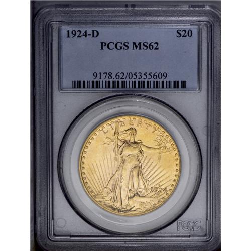 <B>1924-D<$20> MS62 PCGS.</B></I> A better-date issue that is quite scarce. This specimen shows a few abrasions, both on the devices and in the fields, that account for the grade. None of them are especially distracting or singularly mentionable, however, and the overall presentation is pleasing, with copper-gold, lustrous surfaces. <BR><BR><B>Important notice:</B> Heritage usually auctions material at the rate of 200-250 lots per hour. On some occasions eBay Live bid software or the Internet may not be able to keep up with the pace of the auction. We recommend placing a realistic absentee bid now as insurance to avoid disappointment. Occasionally the auctioneer may eliminate or reject an eBay Live bid, and the auctioneer may also reopen a lot after the close of the eBay live bidding (usually because we missed an audience bid), and may reject your bid even if it shows you as the winning bidder. By bidding via eBay Live, you agree that Heritage may award the lot to another bidder at its sole discretion under the circumstances described above or any other reasonable circumstances. Since eBay bids are not shown to us until we open the lot on the floor, we treat those bids just like floor bids. In most cases the floor responds before the eBay bid is presented to us, due to Internet lag time, so for consistency we have made it a policy that floor bids are always considered first over tie eBay live bids. Also please note that all Heritage lots purchased through eBay Live carry a 20% Buyer's Premium. Please make sure you read the Terms and Conditions before you bid. This lot is being auctioned in conjunction with a live floor auction by Heritage Galleries & Auctioneers. All final auction and invoice information will be supplied by Heritage Galleries & Auctioneers, and all other information should be considered preliminary. Lot:4718 <BR><BR><B>Winning Notification and Billing:</B> After the FINAL session in this auction is complete, Heritage will send e-mail and snail mail invoices. This process normally takes several days. All final auction and invoice information will be supplied by Heritage Galleries & Auctioneers, and all other information should be considered preliminary. <BR><BR>This auction will be conducted on a live auction floor and over the Internet through eBay Live. If you choose to place an absentee bid, please take a moment to <font color='#0000ff'><u><a href='http://pages.ebay.com/liveauctions/help/before/laabsentee.html'>learn how eBay Live absentee bidding works</a></u></font><font color='#000000'>