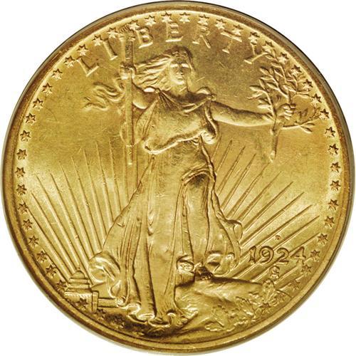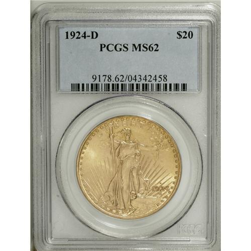 <B>1924-D $20 MS62 PCGS.</B></I> Attractive yellow-gold surfaces boast radiant luster with a tinge of smoky patina near the rims on the reverse. Die erosion shows around the obverse periphery, a common feature on this generous coinage. Perusal with a loupe reveals light abrasions consistent with the grade, but the eye appeal is high.<BR><BR><b>Shipping:</b> Coins & Currency (<a target="_blank" href="http://www.heritageauctions.com/common/shipping.php">view shipping information</a>)