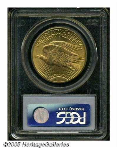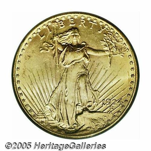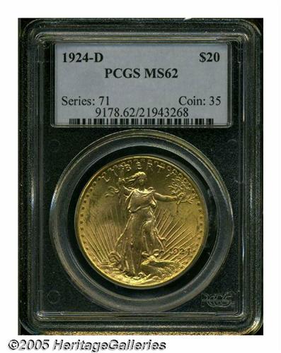 <B>1924-D<$20> MS62 PCGS.</B></I> The 1924-D is the first of the truly scarce mintmarked issues from the 1920s in the Saint-Gaudens series. Most of the Mint State survivors in today's market originated in European hoards of the 1950s, 1960s, and 1970s. This is an attractive coin that displays attractive mint luster and a few small abrasions scattered over each side.