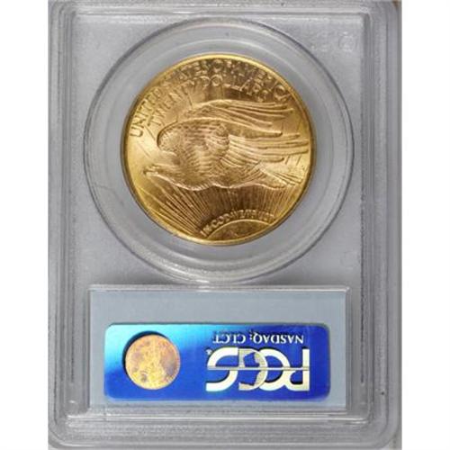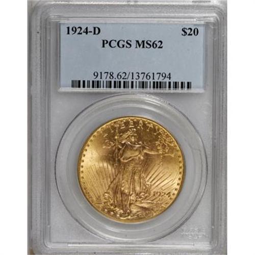 <B>1924-D $20 MS62 PCGS.</B></I> Though all three active Mints struck Saint-Gaudens double eagles in the millions, only those of Philadelphia are readily available today; the vast majority of mintmarked pieces never left the United States and were melted in the 1930s. This peach-tinged apricot-gold example is an exception. This strongly lustrous and well struck piece shows few marks on the reverse, though Liberty's legs exhibit a number of abrasions.<BR><BR><B>Coin Engraver:</B> Augustus Saint-Gaudens<BR><BR><b>Shipping:</b> Coins & Currency (<a target="_blank" href="http://www.heritageauctions.com/common/shipping.php">view shipping information</a>)