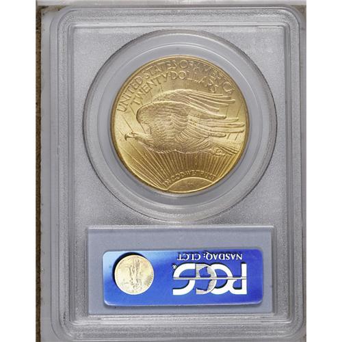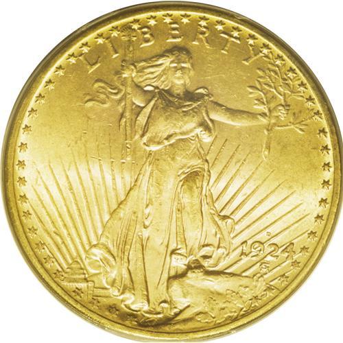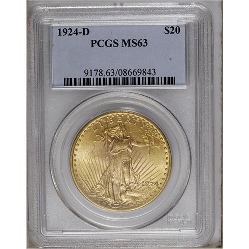 <B>1924-D<$20> MS63 PCGS.</B></I> Although the mintage of over 3 million coins might suggest otherwise, this is an elusive issue in Mint State grades, or in any grade for that matter. Given the divergence between mintage and availability, it seems likely, in fact, almost certainly the case that most remained undistributed, only to be melted in the 1930s after gold coins were recalled. This is an impressive Mint State example with sharp design features and frosty pink-gold luster. The surfaces are quite pleasing for the grade, and overall, this is a highly desirable example.