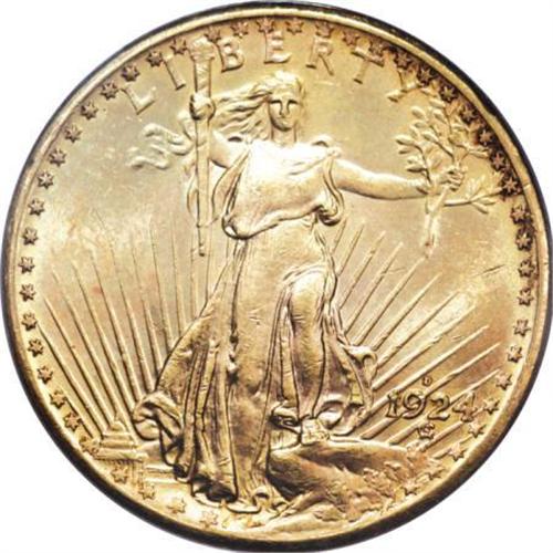 <B>1924-D $20 MS63 PCGS.</B></I> Despite a substantial mintage of over 3 million pieces, the 1924-D is one of the less available Saint-Gaudens issues on the market, a victim of the gold recall and mass melting spurred by the policies of President Roosevelt. The yellow-orange surfaces of this luminous Select survivor show an arc of deeper carrot color at the upper obverse rim. Light, scattered abrasions in the fields and on Liberty's legs preclude a finer grade.<BR><BR><B>Coin Engraver:</B> Augustus Saint-Gaudens<BR><BR><b>Shipping:</b> Coins & Currency (<a target="_blank" href="http://www.heritageauctions.com/common/shipping.php">view shipping information</a>)