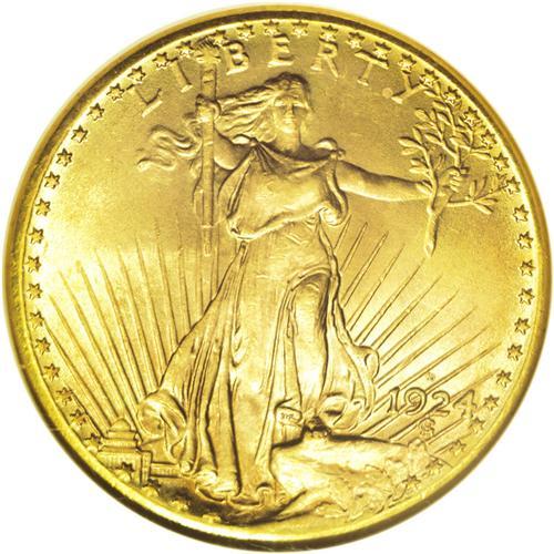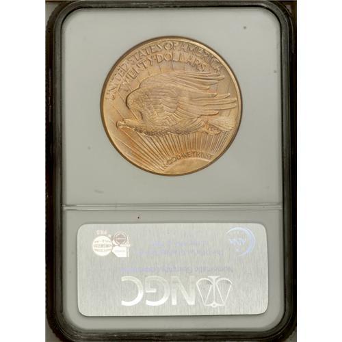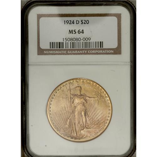 <B>1924-D<$20> MS64 NGC.</B></I> Though more than three million 1924-D double eagles were struck, the vast majority never left the Treasury. In lower Mint State grades, this issue is somewhat available, thanks to small hoards discovered in various banks overseas, but quality coins remain elusive to this day. This lustrous example has amber surfaces tinged with yellow, strawberry-gold, and pale green, and the strike is mostly sharp, though the peripheral devices have slight weakness, typical for this issue. Small abrasions in the fields and a mark on Liberty's left (facing) arm keep this coin from a higher grade. NGC has certified only nine coins finer than this near-Gem, and PCGS has certified a mere six (7/06).