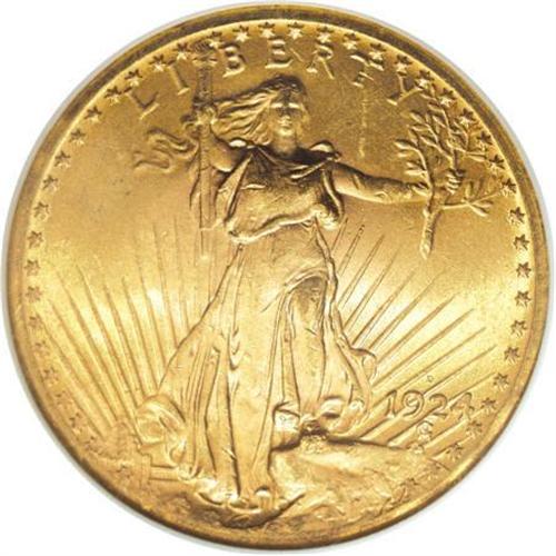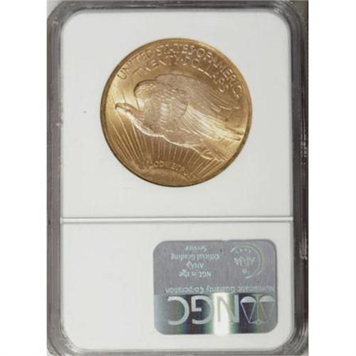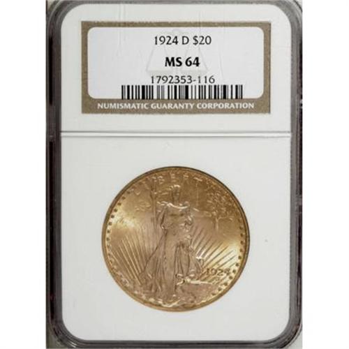 <B>1924-D $20 MS64 NGC.</B></I> For the Saint-Gaudens specialist, this is an important issue that is almost impossible to locate any finer. For example, NGC has only graded 11 Gem quality 1924-D double eagles, while PCGS has seen only nine. Although the surfaces have trivial abrasions that prevent a Gem assessment, both sides of this lovely piece are fully brilliant with frosty luster and traces of desirable pink toning over honey-gold color. Although not fully struck, most of the design elements are sharply detailed, save for some peripheral weakness, that according to Jeff Garrett and Ron Guth (2006), is associated with "... worn dies ... as quality control was lacking (perhaps caused by the enormous amount of coins that were minted)."<BR><BR><B>Coin Engraver:</B> Augustus Saint-Gaudens<BR><BR><b>Shipping:</b> Coins & Currency (<a target="_blank" href="http://www.heritageauctions.com/common/shipping.php">view shipping information</a>\)