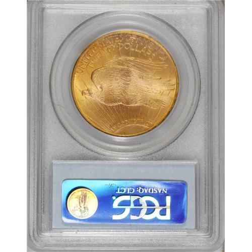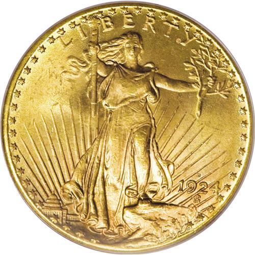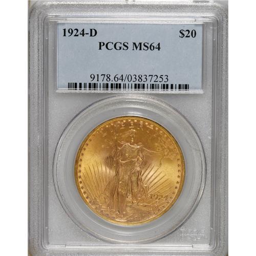 <B>1924-D $20 MS64 PCGS.</B></I> A second example of this essentially unimprovable issue, with beautiful, reddish tinted mint luster radiating from the orange-gold surfaces. While PCGS has certified several dozen pieces in this near-Gem grade, that service has graded only eight Gem pieces, with an additional 11 MS65s at NGC (3/07), including, as always, the inevitable duplications. Despite the recorded mintage of just over 3 million pieces, the vast majority of this midseries issue was undoubtedly first stored, then later melted during the 1930s gold recall. Most Mint State survivors are likely repatriated coins from overseas. This piece shows a few light, grade-consistent contact marks on the obverse highpoints that keep it from a Gem grade, but it is an appealing piece with good color and strike, and superb luster.<BR><BR><b>Shipping:</b> Coins & Currency (<a target="_blank" href="http://www.heritageauctions.com/common/shipping.php">view shipping information</a>)