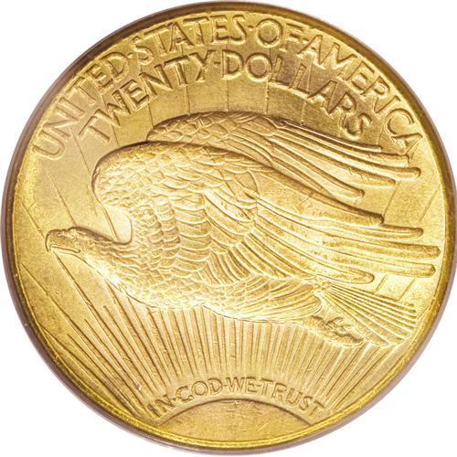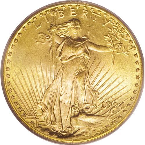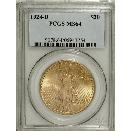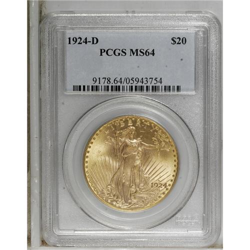 <B>1924-D $20 MS64 PCGS.</B></I> Although more than 3 million of these coins were originally produced, few were exported and most of those that remained in the U.S. were melted during the mid and late 1930s. A few were obtained by coin collectors, and have remained in numismatic circulation since the 1920s. Others were sent overseas, and have recently returned to this country, although the number of such pieces is quite small. This example is a richly lustrous near-Gem specimen with deep yellow and orange gold color. The surfaces have a few trivial marks that limit the grade, but the overall eye appeal is excellent. PCGS has only graded eight finer examples of the date (4/07).<BR><BR><b>Shipping:</b> Coins & Currency (<a target="_blank" href="http://www.heritageauctions.com/common/shipping.php">view shipping information</a>)
