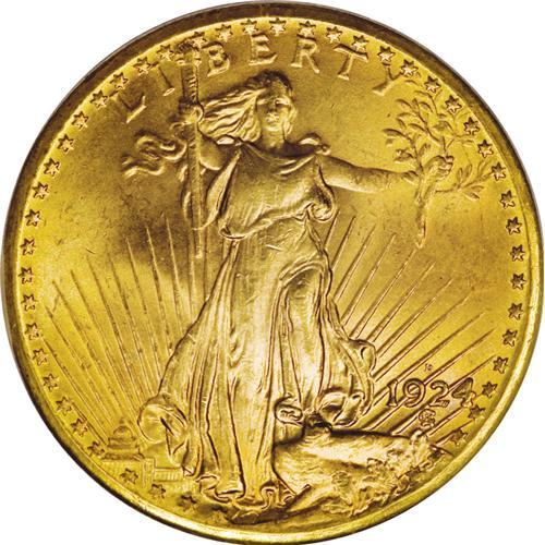 <B>1924-D $20 MS64 PCGS.</B></I> An imposing Choice Mint State piece with deep orange-gold color, slightly lighter on the devices, and amazing frosty mint luster. The surfaces are pristine, and nearly mark-free. We are not quite certain why this piece has not been given a Gem grade. While the mintage of the '24-D was substantial, with over 3 million pieces coined, many were exported and most others were melted in the 1930s. While some examples have returned from their trip abroad, most of the highest grade coins have remained in American collections since the time of issue. PCGS has only certified eight finer examples of the date (4/07).<BR><BR><b>Shipping:</b> Coins & Currency (<a target="_blank" href="http://www.heritageauctions.com/common/shipping.php">view shipping information</a>)