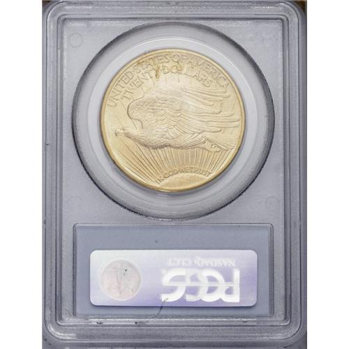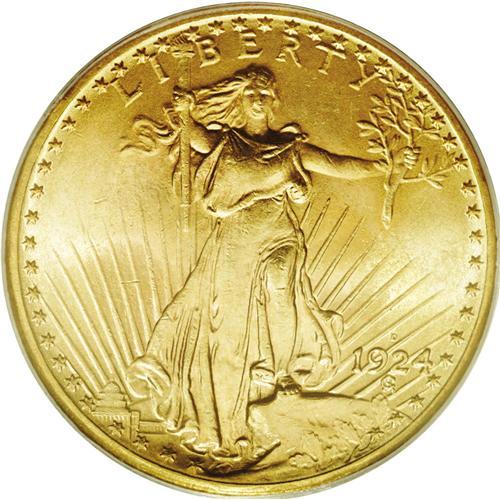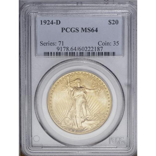 <B>1924-D<$20> MS64 PCGS.</B></I> Despite a sizeable mintage of 3 million coins, the 1924-D is one of the premier rarities in the Saint-Gaudens double eagle series. This issue is of comparable overall rarity to the 1925-D and 1926-S, all of which apparently suffered widespread melting at the hands of the federal government. Intense, golden patina intermingles with soft orange iridescence to present a mosaic of numismatic beauty. There are a few small abrasions on the obverse and reverse, but the number of distractions is typically minimal for the grade. With radiant cartwheel luster and above average striking quality, this coin's technical quality adequately complements its eye appeal.