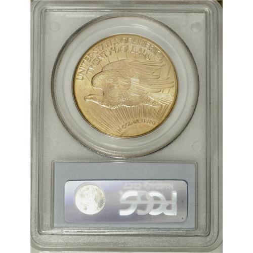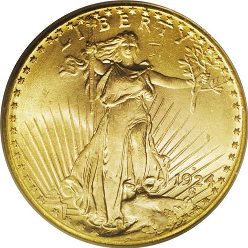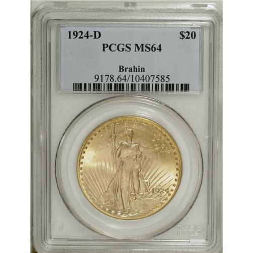 <B>1924-D $20 MS64 PCGS.</B></I> Ex: Brahin. Aside from the 1923-D, which must have been distributed in a different manner, all branch mint double eagles from the 1920s and 1930s are rare. Philadelphia dates between 1922 and 1928 survived the 1933 gold recall in sufficient quantities for today's collectors, but the 1924-D did not, despite a production of more than 3 million pieces. Apparently, bags of the 1924-D remained at the Treasury, although any collector could have obtained an example for face value, or close to it, prior to 1933. Most 1924-D twenties were melted, and among those that remain, the majority are in AU58 to MS63 grades. MS64 is the highest collectible grade, since PCGS has certified just seven pieces finer (11/06). This lustrous apricot and green-gold near-Gem has a well preserved obverse, and the reverse is also pleasing despite a couple of minor marks on the front wing. A splendid opportunity for the rare date gold specialist.<BR><BR><b>Shipping:</b> Coin/Currency (<a target="_blank" href="http://www.heritageauctions.com/common/shipping.php">view shipping information</a>)