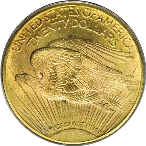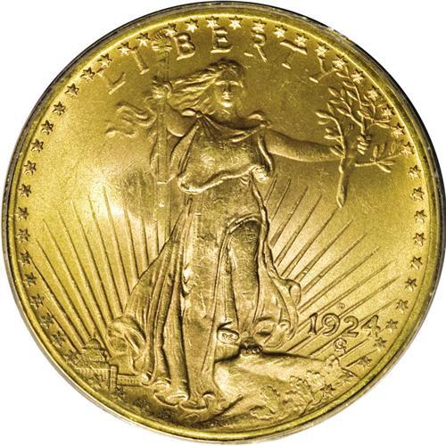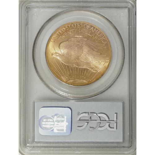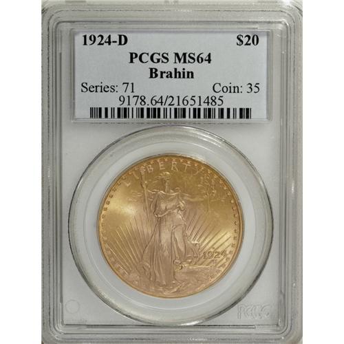 <B>1924-D $20 MS64 PCGS.</B></I> Ex: Brahin. This is a stunning near-Gem specimen with frosty luster and amazing coloration, blending olive, honey, and pink tones on both sides. Although it is not fully struck, most of the design characteristics are nicely detailed. In Choice Mint State grades, this date is not a major rarity, but it is almost never encountered any finer. PCGS has only certified seven better pieces, for example (12/06). The vast majority of the 3 million coins struck were melted within a decade or so, although some untold but small quantity was certainly sent over to Europe. Jeff Garrett and Ron Guth suggest that "a few thousand" were exported in the 1920s.<BR><I>From The Matt & Susan Brown Family Collection of Saint-Gaudens Double Eagles.</B></I><BR><BR><b>Shipping:</b> Coin/Currency (<a target="_blank" href="http://www.heritageauctions.com/common/shipping.php">view shipping information</a>)