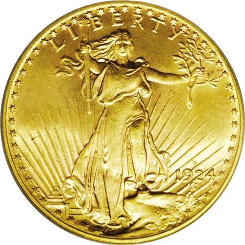 <B>1924-D $20  MS64 PCGS.</B></I> The 1923-D and the 1924 are quite common in Mint State, and with a mintage of more than 3 million pieces, one would suppose that the 1924-D is also readily available. Such a conclusion would be correct, of course, were it not for Franklin Roosevelt's attempted solution of the Great Depression. To inflate the economy, the dollar was devalued as measured by gold bullion. Roosevelt legally obliged citizens to redeem gold coins in return for paper money, the government then melted the coins into bullion bars which served to support the currency. Only a miniscule percentage of 1924-D twenties survived the smelter, most of which resided in European vaults for decades until their numismatic importance was recognized. Most 1924-D double eagles are Uncirculated but show bagmarks from their indifferent shipment and storage. For the present piece, however, only a small mark in the left obverse field denies status as a full Gem. Near-Gem specimens provide an affordable and obtainable alternative.