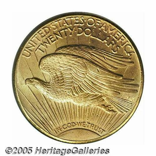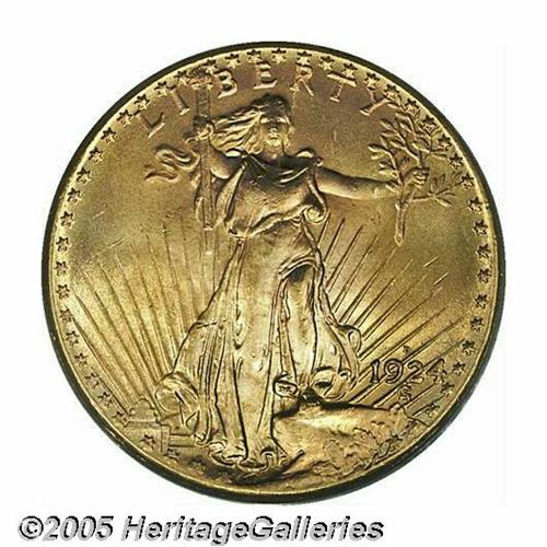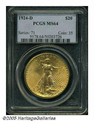 <B>1924-D<$20> MS64 PCGS.</B></I> The 1924-D is a median rarity in the series and is comparable in rarity to the 1925-D and 1926-S. Generally not located outside the AU55 to MS62 grade range, this piece represents an important opportunity for the advanced date and mintmark collector. The surfaces on this coin have almost the same luster characteristics as the previous year's issue from the Denver mint, the famous 1923-D. Rich rose-golden patina is swirled around each side with intermittent dashes of pale lilac. Only a couple of abrasions keep this lovely piece from full Gem classification: a pair of marks to the right of Liberty's head, and another across the drapery near Liberty's knee. An opportunity for the collector to acquire this difficult issue with exceptional surface preservation and luster characteristics. Population: 115 in 64, 5 finer (5/05).