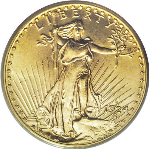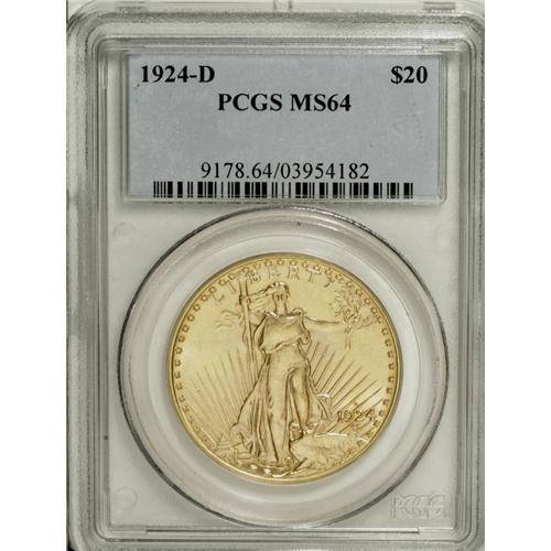 <B>1924-D $20 MS64 PCGS.</B></I> The topsy-turvy world of Saint-Gaudens coinage is one where mintages are meaningless and the melting pot makes major rarities. The vast majority of the 3,049,500 1924-D double eagles coined remained in government vaults until the executive recall of 1933, and just a fraction of them escaped destruction. Those that survived often faced circulation or careless storage, and Select and finer representatives remain elusive.<BR> The pale yellow-gold surfaces display strong luster and an above-average strike. Aside from a handful of tiny ticks, the devices are clean, and the few abrasions present in the fields are shallow, short, and well-distributed. Garrett and Guth write that for the 1924-D, "a coin grading MS64 is about as nice as a collector can hope to secure." Similarly, this representative is among the best-preserved certified examples not found in a Gem holder. PCGS has graded only eight pieces finer (3/07).<BR><BR><b>Shipping:</b> Coins & Currency (<a target="_blank" href="http://www.heritageauctions.com/common/shipping.php">view shipping information</a>)