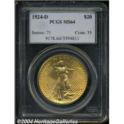 <table><tbody><tr><td><table> <TR><TD width="100%"><TABLE cellSpacing=1 cellPadding=3 width="100%" border=0><TBODY><TR><TD width="100%" bgColor=#79735c><FONT face=arial color=#ffffff size=3><B>Description</B> </FONT></TD></TR><TR><TD width="100%" bgColor=#ffffff><FONT face=arial size=2><B>1924-D $20 MS64 PCGS.</B></I> The 1924-D is the first of the scarce to rare mintmarked issues that continue through the end of the Saint-Gaudens Double Eagle series. The majority of Mint State survivors in today's market originated in European hoards of the 1950s, 1960s, and 1970s. Writing in 1988, Breen stated that a further 70 pieces were discovered in the summer of 1983. (Perhaps these coins were in the same Central American hoard that produced several Mint State 1909-D and 1922-S Double Eagles at around this time?) The pale orange-gold color equally overlays each side in a very subtle manner. Die deterioration around the rims is often a problem for the issue, but the present survivor displays good definition in virtually all areas. A few small marks are seen on the eagle and a single abrasion exists on Liberty's left thigh, these being the grade-limiting factors.<BR><I>From a Magnificent Collection of Double Eagles.</B></I> </FONT></TD></TR></TBODY></TABLE></TD></TR></TBODY></TABLE><BR><A name=PricesRealized></A><TABLE cellSpacing=0 cellPadding=0 width="100%" bgColor=#000000 border=0><TBODY><TR><TD width="100%"><TABLE cellSpacing=1 cellPadding=3 width="100%" border=0><TBODY><TR><TD width="100%" bgColor=#79735c><A name=PR><FONT face=arial color=#ffffff size=3><B>Previous Prices from Heritage Auctions</B> </FONT></A></TD></TR><TR><TD bgColor=#f6f6ed><TABLE cellSpacing=0 cellPadding=0 width="100%" border=1><TBODY><TR><TD align=middle width="33%"><B>Date</B></TD><TD align=middle width="33%"><B>Service</B></TD><TD align=middle width="33%"><B>Price</B></TD></TR><TR bgColor=whitesmoke><TD width="33%"><B>01/07/2004</B></TD><TD width="33%">NGC</TD><TD width="33%">$9,775.00</TD></TR><TR bgColor=whitesmoke><TD width="33%"><B>01/11/2003</B></TD><TD width="33%">PCGS</TD><TD width="33%">$7,015.00</TD></TR><TR bgColor=whitesmoke><TD width="33%"><B>10/06/2000</B></TD><TD width="33%">PCGS</TD><TD width="33%">$7,302.50</TD></TR><TR bgColor=whitesmoke><TD width="33%"><B>01/08/1999</B></TD><TD width="33%">NGC</TD><TD width="33%">$12,650.00</TD></TR><TR bgColor=whitesmoke><TD width="33%"><B>06/04/1995</B></TD><TD width="33%">NGC</TD><TD width="33%">$10,120.00</TD></TR><TR bgColor=whitesmoke><TD width="33%"><B>02/05/1994</B></TD><TD width="33%">NGC</TD><TD width="33%">$13,750.00</TD></TR><TR bgColor=whitesmoke><TD width="33%"><B>03/01/2000</B></TD><TD width="33%">PCGS</TD><TD width="33%">$9,315.00</TD></TR><TR bgColor=whitesmoke><TD width="33%"><B>08/01/1996</B></TD><TD width="33%">PCGS</TD><TD width="33%">$12,100.00</TD></TR><TR bgColor=whitesmoke><TD width="33%"><B>02/01/1999</B></TD><TD width="33%">PCGS</TD><TD width="33%">$10,350.00</TD></TR><TR bgColor=whitesmoke><TD width="33%"><B>11/01/2001</B></TD><TD width="33%">NGC</TD><TD width="33%">$6,900.00</TD></TR></TBODY></TABLE></TD></TR><TR><TD bgColor=#ffffff><FONT face=arial size=1 ?>PLEASE NOTE: All prices realized reflect the final hammer price PLUS the buyer's premium in auctions that charge a buyer's premium. Each item has a notation at the top of the listing indicating whether that lot included a buyer's premium. Example: A item that sells with a final hammer price of $100 and a 20% buyer's premium will display with a price realized of $120. All information listed is intended to be as accurate as possible, but errors are possible. Please use this guide carefully and inform us of any inaccuracies. </FONT></TD></TR></TBODY></TABLE></TD></TR></TBODY></TABLE><BR><TABLE cellSpacing=0 cellPadding=0 width="100%" bgColor=#000000 border=0><TBODY><TR><TD width="100%"><TABLE cellSpacing=1 cellPadding=3 width="100%" border=0><TBODY><TR><TD width="100%" bgColor=#79735c colSpan=6><FONT face=arial color=#ffffff size=3><B>Price Guide*</B> </FONT></TD></TR><TR bgColor=#f6f6ed><TD align=middle><B>Grade</B> </TD><TD align=middle><B>Coin World<BR>(Trends)</B> </TD><TD align=middle><B>Numismedia<BR>Retail</B> </TD><TD align=middle><B>Numismedia<BR>Wholesale</B> </TD><TD align=middle><B>Coin<BR>Universe</B> </TD><TD align=middle><B>Heritage<BR>Value Index</B> </TD></TR><TR bgColor=#ffffff><TD align=middle>63</TD><TD align=right>$7,500.00</TD><TD align=right>---</TD><TD align=right>$4,025.00</TD><TD align=right>$6,000.00</TD><TD align=right>$4,725.00</TD></TR><TR style="FONT-WEIGHT: bold" bgColor=#cccfdd><TD align=middle>64</TD><TD align=right>$14,000.00</TD><TD align=right>---</TD><TD align=right>$7,350.00</TD><TD align=right>$11,000.00</TD><TD align=right>$8,003.75</TD></TR><TR bgColor=#ffffff><TD align=middle>65</TD><TD align=right>$50,000.00</TD><TD align=right>---</TD><TD align=right>$44,500.00</TD><TD align=right>---</TD><TD align=right>$40,133.33</TD></TR><TR bgColor=#ffffff><TD colSpan=6><FONT size=1>*All information listed is intended to be as accurate as possible, but errors are possible. No item may be returned or refused based on this information which is provided as a service to our customers. You should contact each pricing source directly to determine the accuracy of this information. </FONT></TD></TR></TBODY></TABLE></TD></TR></TBODY></TABLE><BR><TABLE cellSpacing=0 cellPadding=0 width="100%" bgColor=#000000 border=0><TBODY><TR><TD width="100%"><TABLE cellSpacing=1 cellPadding=3 width="100%" border=0><TBODY><TR><TD width="100%" bgColor=#79735c><FONT face=arial color=#ffffff size=3><B>Population Guide</B> </FONT></TD></TR><TR bgColor=#ffffff><TD align=middle><!-- Begin Output of Population Grid--><TABLE cellSpacing=0 cellPadding=0 width="100%" border=0><TBODY><TR><TD vAlign=center><TABLE cellSpacing=0 width="100%" border=1 cellsadding="3"><TBODY><TR><TD vAlign=center><TABLE cellSpacing=0 cellPadding=3 width="100%" border=1><TBODY><TR><TD vAlign=center align=middle bgCol