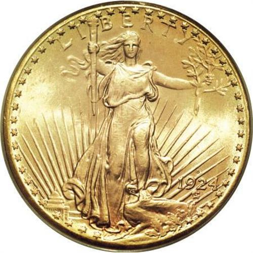 <B>1924-D $20 MS64 PCGS.</B></I> The 1924-D, along with its S-mint counterpart of the same year, is one of the earliest "melt rarities" in the Saint-Gaudens double eagle series. Garrett and Guth speculate that up to "a few thousand" survived the gold recall of the Roosevelt administration, but high-end examples are unavailable, and a Choice example such as the present piece is the best all but a handful of collectors can hope to acquire.<BR> Peach-inflected yellow-gold surfaces offer soft, swirling luster on this lovely near-Gem. The central devices are well-defined and show few flaws overall, though a single abrasion is noted near Liberty's waist. Slightly hazy from likely extended storage, but a pleasing representative nonetheless. PCGS has graded only nine finer examples (2/08).<BR><BR><B>Coin Engraver:</B> Augustus Saint-Gaudens<BR><BR><b>Shipping:</b> Coins & Currency (<a target="_blank" href="http://www.heritageauctions.com/common/shipping.php">view shipping information</a>)
