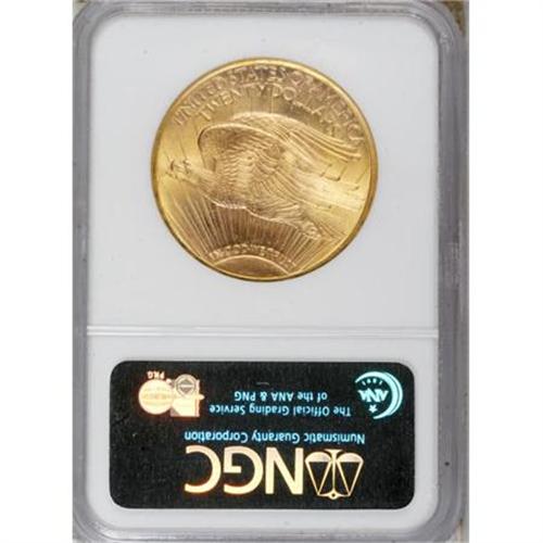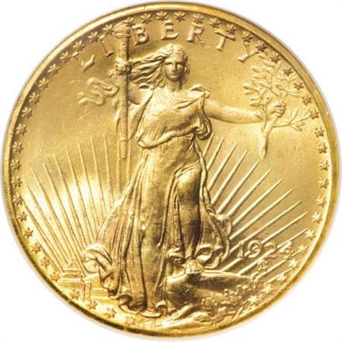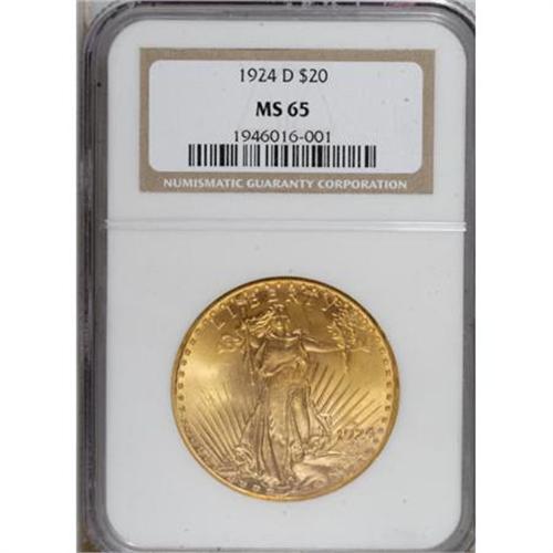 <B>1924-D $20 MS65 NGC.</B></I> While D-mint double eagles dated as late as 1923 were heavily represented in overseas hoards, pieces from 1924 and beyond are considerably less available. Double eagles stored at Philadelphia and (to a much lesser extent) San Francisco were much more accessible for international commerce, and the vast majority of the over 3 million 1924-D twenties coined were melted, having never left the Mint grounds. The Denver issues of later years are just as elusive or more so, including the notoriously unavailable 1927-D.<BR> Of the fraction sent overseas and later repatriated, most are in Mint State grades, but at the low end of the scale; this issue's entry in the NGC <I>Census Report</B></I> shows a handful of examples in various states of About Uncirculated, with larger quantities of MS60 and MS61 pieces. The vast majority fall somewhere between MS62 and MS64. Garrett and Guth (2006) comment about the challenging nature of the issue: "To date, fewer than 1,000 examples have been certified, and a coin grading MS64 is about as nice as a collector can hope to secure."<BR> The representative offered here, however, transcends that limitation. The shining surfaces are predominantly apricot-gold, and the margins offer elements of peach. Pleasingly detailed overall with a touch of weakness at the peripheral stars, suggestive of a modestly worn obverse die. Highly appealing and solid for the grade with no individually mentionable marks. With a combined population of just 16 Gems and only three finer examples certified between NGC and PCGS (1/08), this MS65 piece represents an excellent opportunity to enhance one's first-class collection of Saint-Gaudens gold.<BR><BR><B>Coin Engraver:</B> Augustus Saint-Gaudens<BR><BR><b>Shipping:</b> Coins & Currency (<a target="_blank" href="http://www.heritageauctions.com/common/shipping.php">view shipping information</a>)